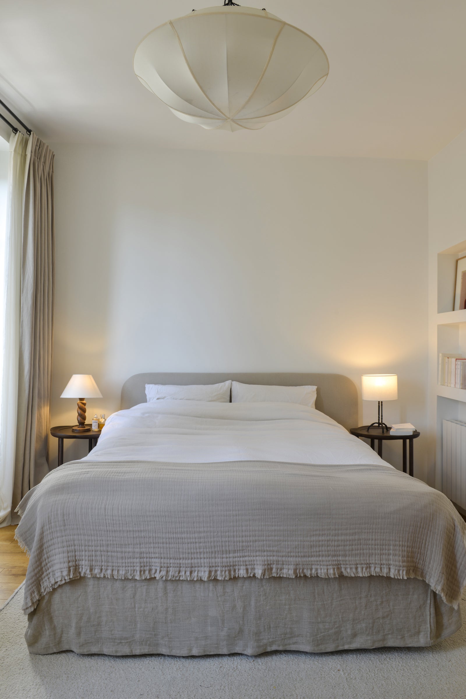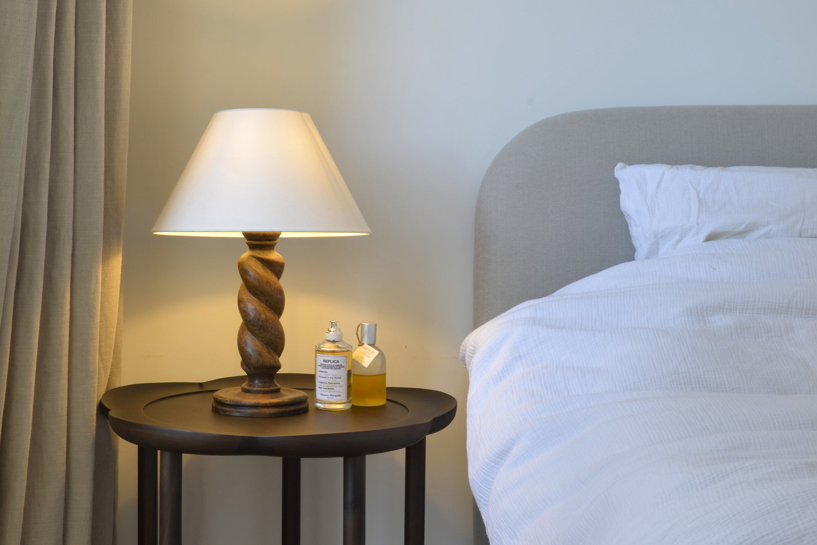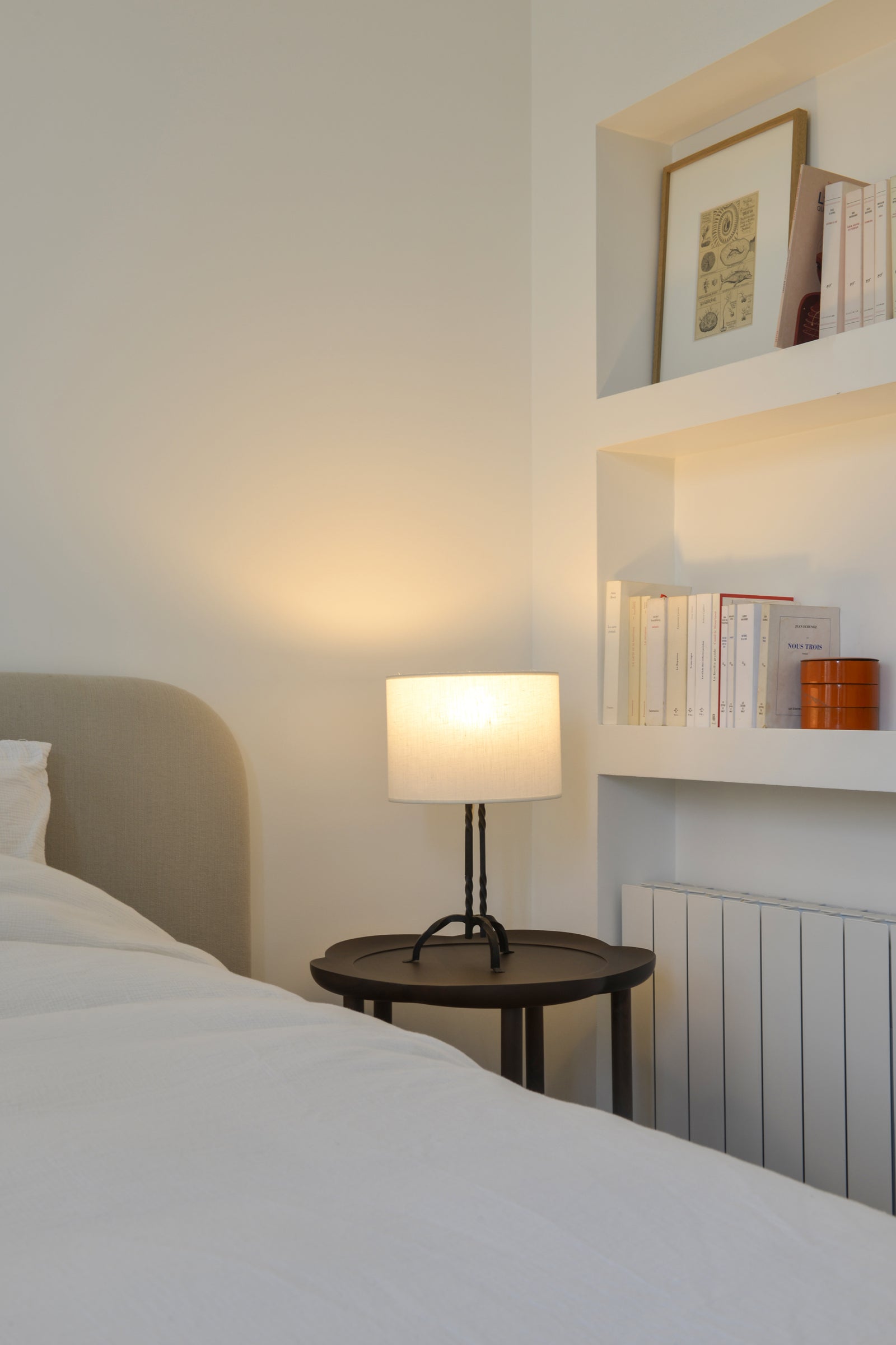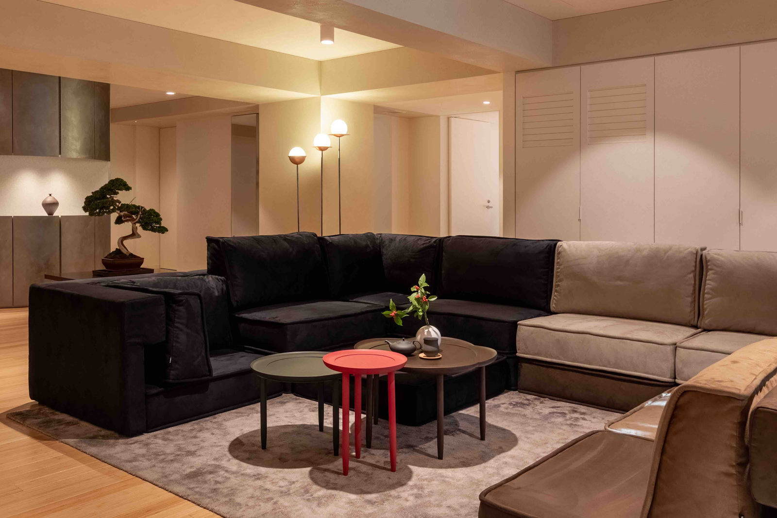 Une table basse ornée d'un magnifique motif géométrique de fleurs de prunier en fin d'hiver, symbolisant l'abondance de la vie.