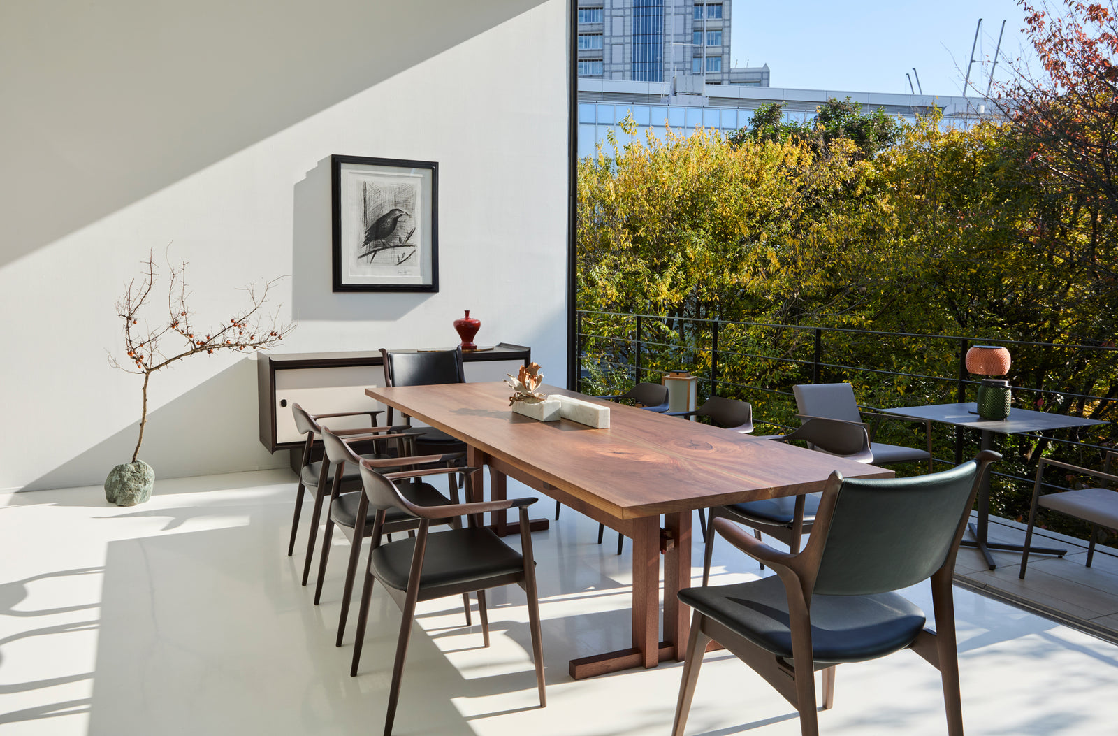 Une table en bois brut, taillé symétriquement, provenant d'arbres très anciens. La symétrie, légèrement contrastée par la ligne de séparation en laiton, insuffle à la pièce une vitalité saisissante. Ses pieds droits s'inspirent de l'architecture des temples japonais.