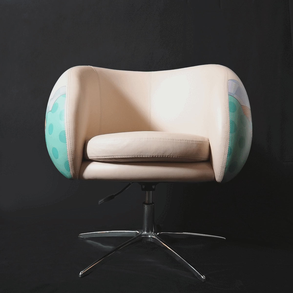 The iconic Kabuto chair, inspired by the face mask of a samurai, is reimagined through Belowkey’s graffiti art. Bold, colorful strokes unfold across the leather surface, transforming this refined form into a vivid dialogue between Japanese craftsmanship and New York street energy.
